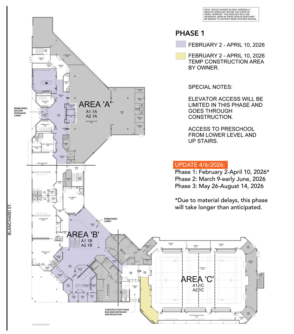 *Due to material delays, this phase will take longer than anticipated. Front desk operations and the facility entrance will remain in their current temporary locations.
